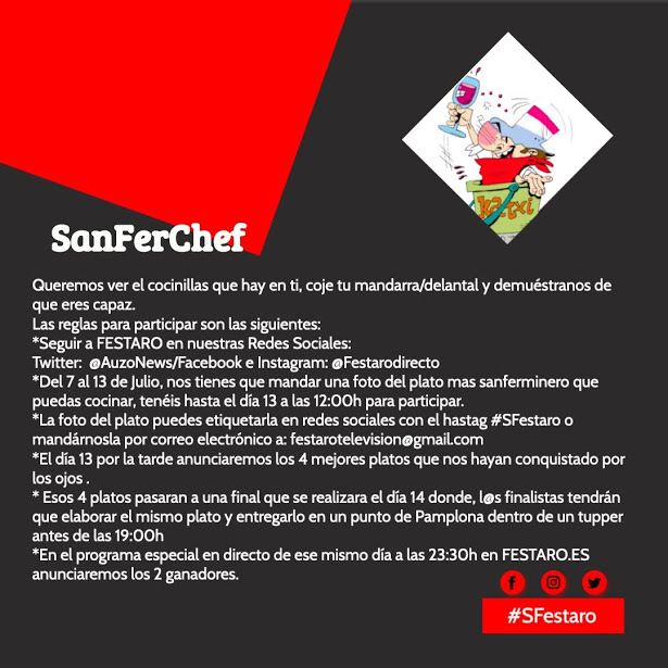 *Del 7 al 13 de Julio, nos tienes que mandar una foto del plato mas sanferminero que puedas cocinar, tenéis hasta el día 13 a las 12:00h para participar.